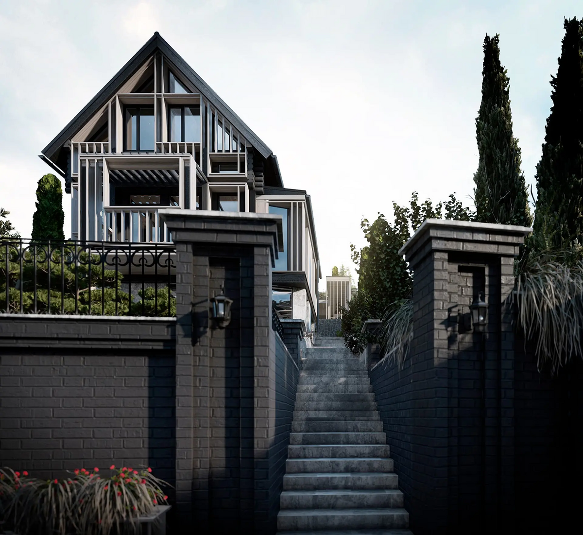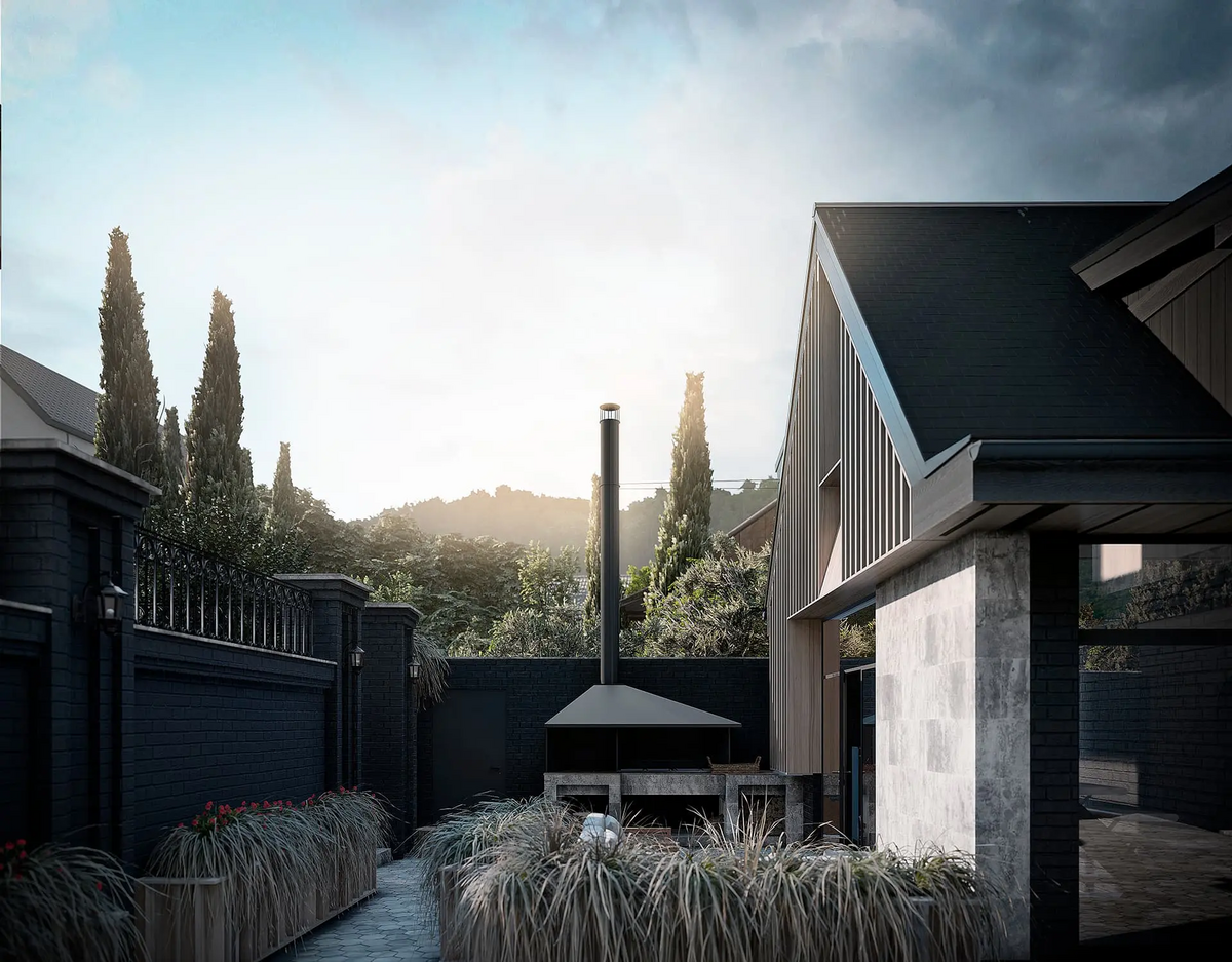 Участок располагается на склоне горы при озере Тургояк в городе Миасс. На участке имеется комплекс из существующих построек, возведённых двадцать один год назад назад. Комплекс состоит из трёх крупных объектов: кирпичного гаража при въезде, дачного дома с баней из бревна. Все объекты расположены на горизонтальных площадках в несколько уровней следуя рельефу. Задача состояла в сохранении основных конструкций всех объектов, но с помощью небольших и осторожных изменений переработать их в объекты для постоянного комфортного использования и новой эстетической нагрузкой. Здание Банного комплекса претерпело минимальное количество планировочных изменений и было дополнено крытой террасой с обеденной зоной при существующей печи с мангалом. Верхняя часть отдана под рекреационную зону с открытой террасой, бассейном и беседкой. Имеющиеся на участке элементы из красного кирпича, что с течением времени приобрёл хаотичные оттенки, окрашены в чёрный цвет, через который удалось увязать всё многообразие использованных отделочных материалов ландшафте. Кроме того, весь комплекс обрёл единую эстетику благодаря использованию навесного деревянного декора, а также развил игру существующих объектов и многоплановость всей композиции.