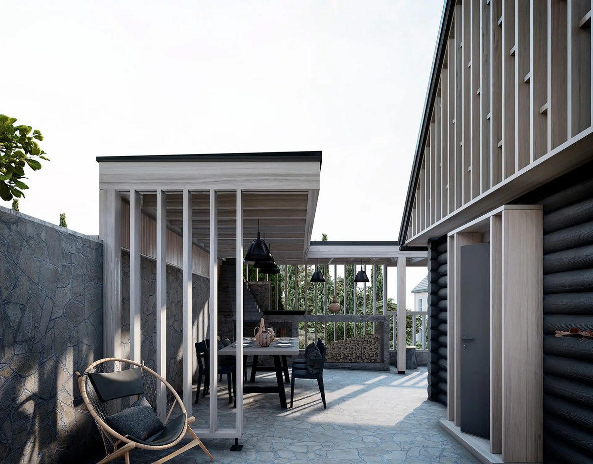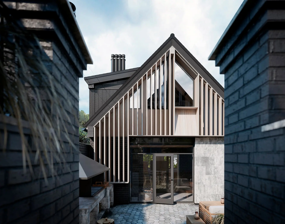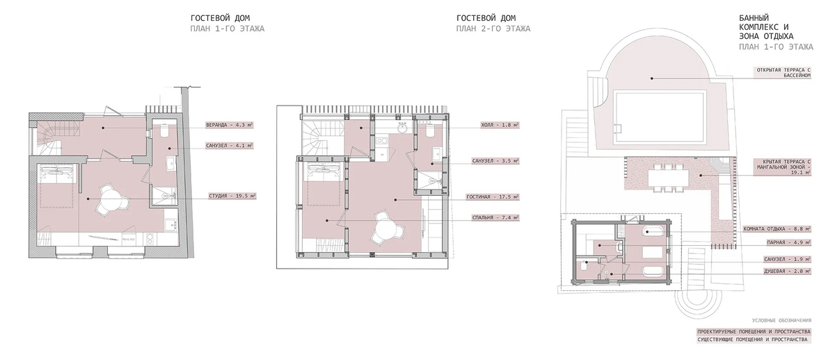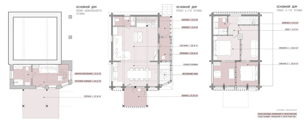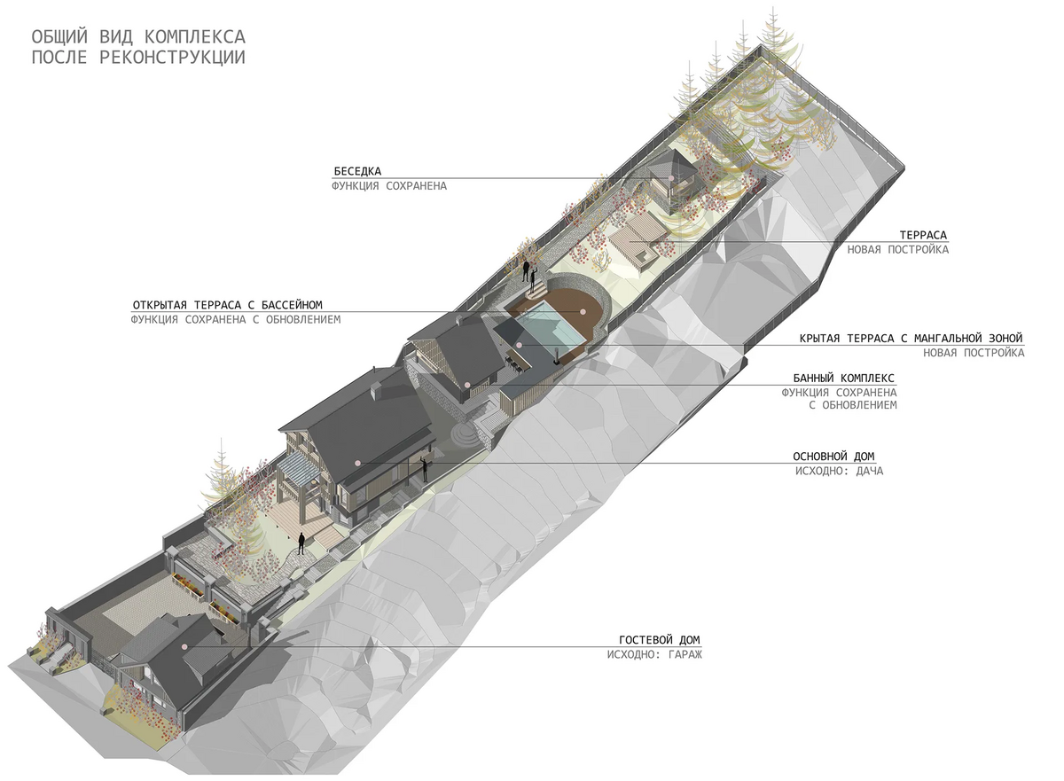 Так гараж был переработан в Гостевой дом, расширен и дополнен мансардным вторым этажом: на первом этаже расположилась студия, на втором этаже студия со спальней. Дачный дом был перепланирован и превращён Основной дом, в котором были предусмотрены отсутствующие помещения для удобного постоянного проживания, а также расширен за счёт имеющейся террасы на каждом из двух этажей.