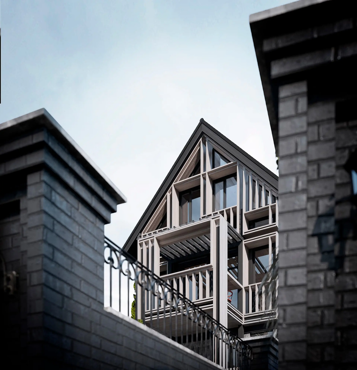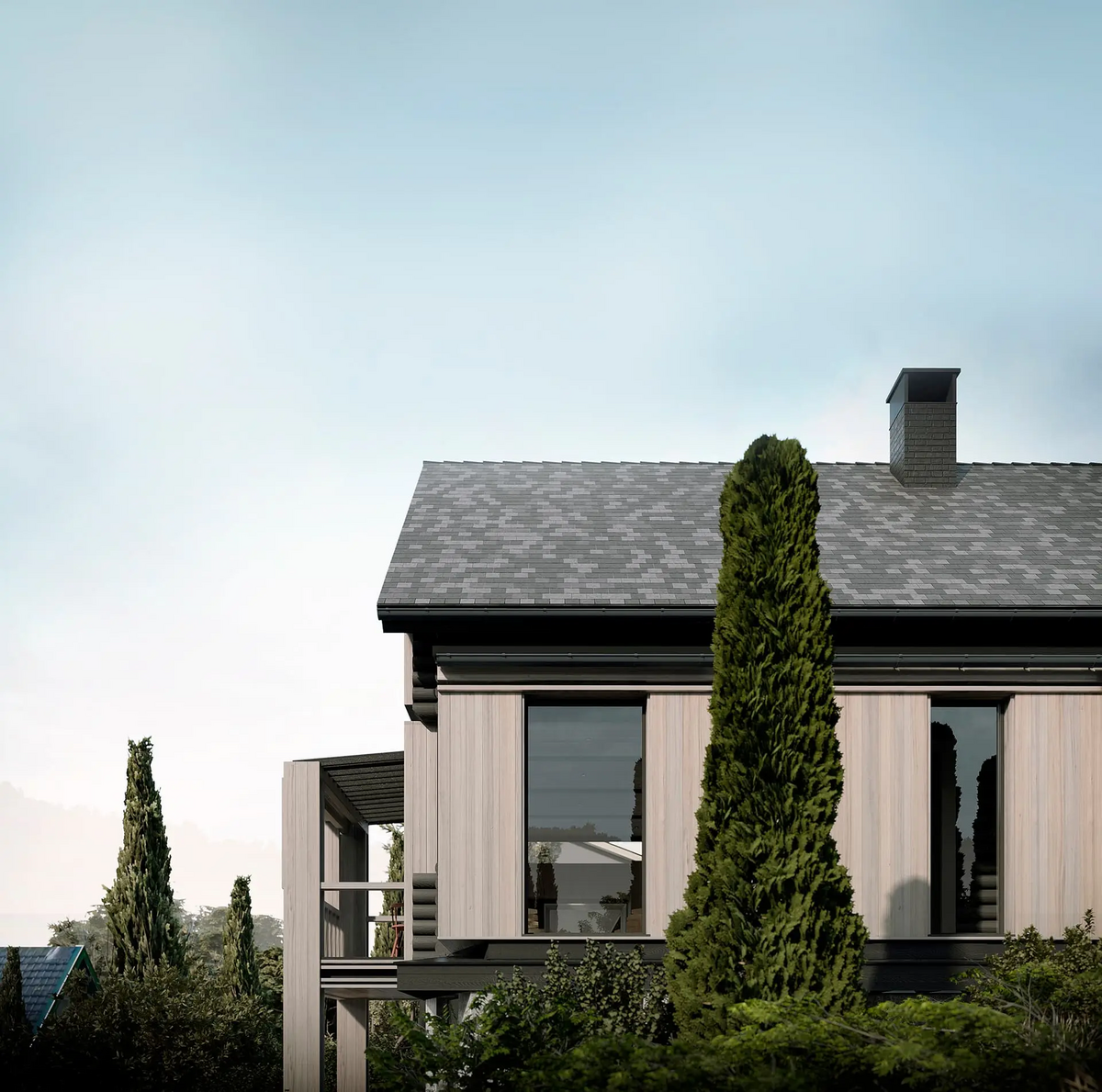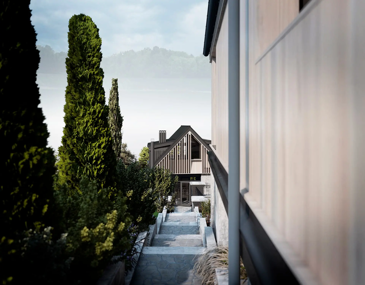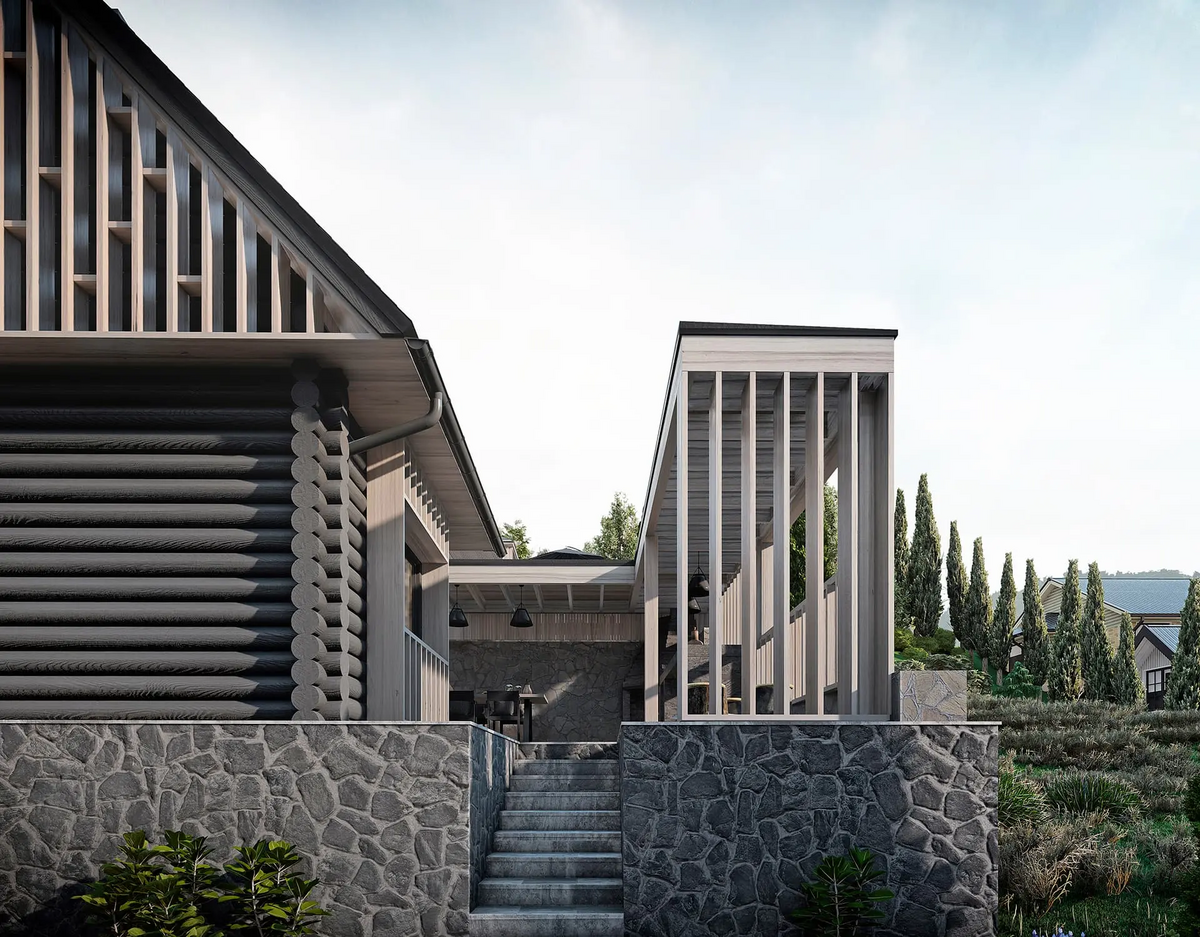 Так гараж был переработан в Гостевой дом, расширен и дополнен мансардным вторым этажом: на первом этаже расположилась студия, на втором этаже студия со спальней. Дачный дом был перепланирован и превращён Основной дом, в котором были предусмотрены отсутствующие помещения для удобного постоянного проживания, а также расширен за счёт имеющейся террасы на каждом из двух этажей.
