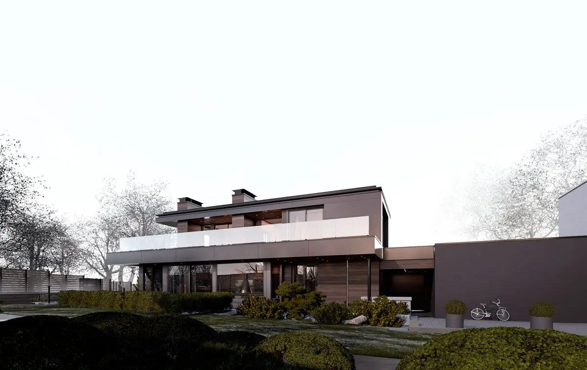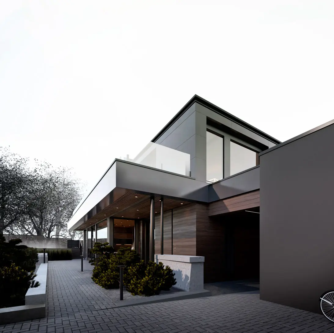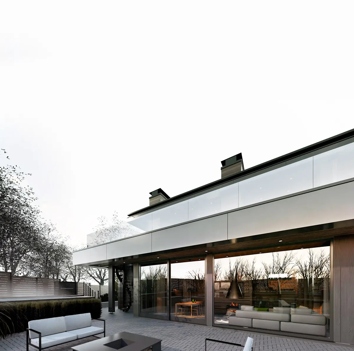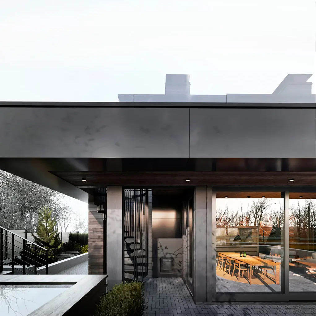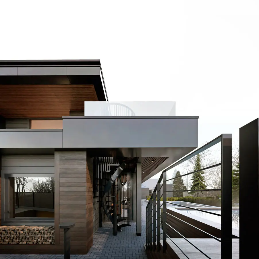 Стилистическое объединение двух построек происходит как через архитектуру, так и применяемые материалы отделки на сборных навесных конструкциях в виде деревянного планкена и композитных алюминиевых панелей. Внутри бани на первом этаже устроена просторная гостиная, кухня и столовая.